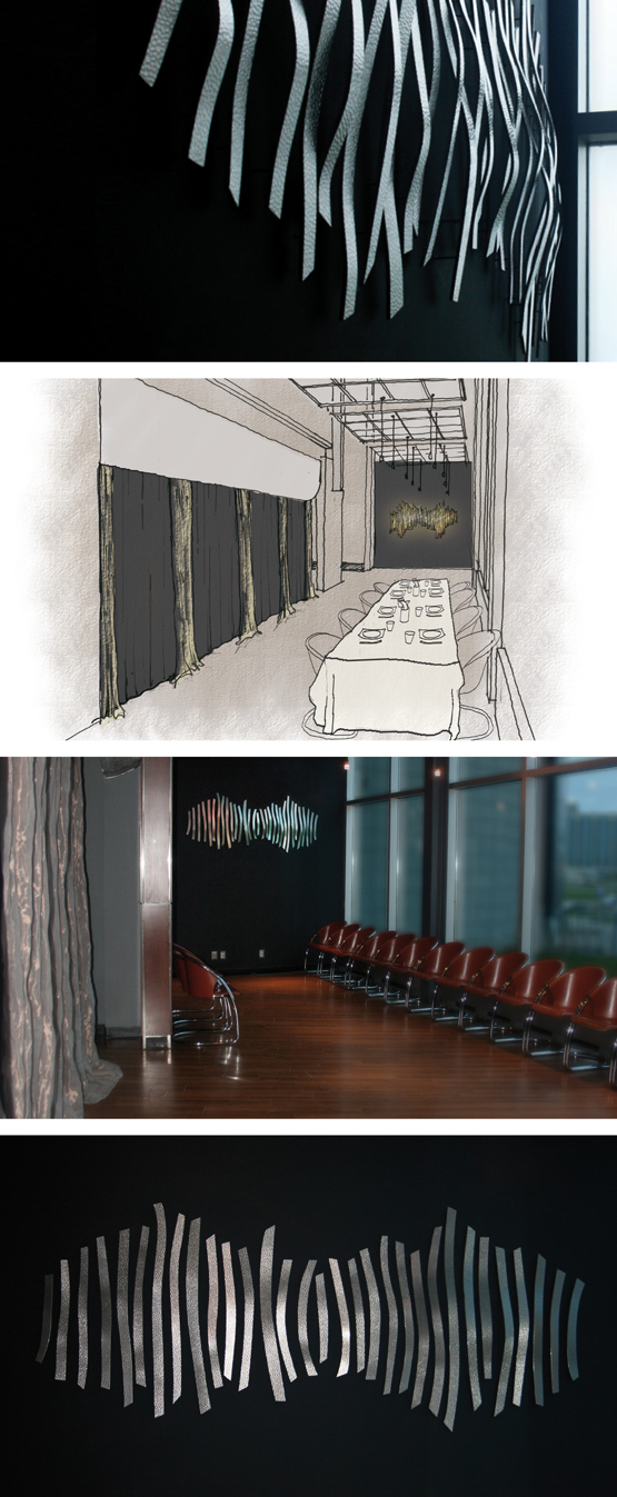 À partir des esquisses initiales, des techniques de réalisation ont été développés en collaboration avec l’atelier Kamikaze pour tenir compte de l’installation et des défis particuliers de l’idée. Pour s’harmoniser avec la sculpture, nous avons choisi d’utiliser, pour les rideaux, un tissu qui est un tissage de fils d’aluminium et de cuivre, qui a nécessité une collaboration étroite avec l’équipe de Télio et la couturière de Prisme 3.